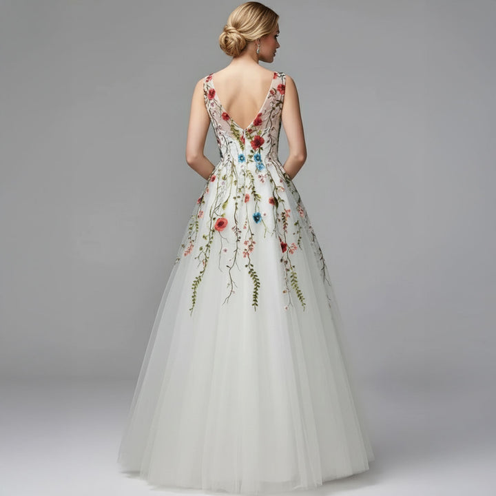 Elegantly adorned with vibrant botanical embroidery, this stunning wedding dress is ideal for nature-inspired ceremonies and other important events.